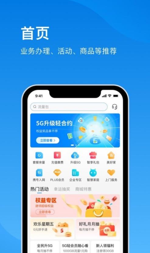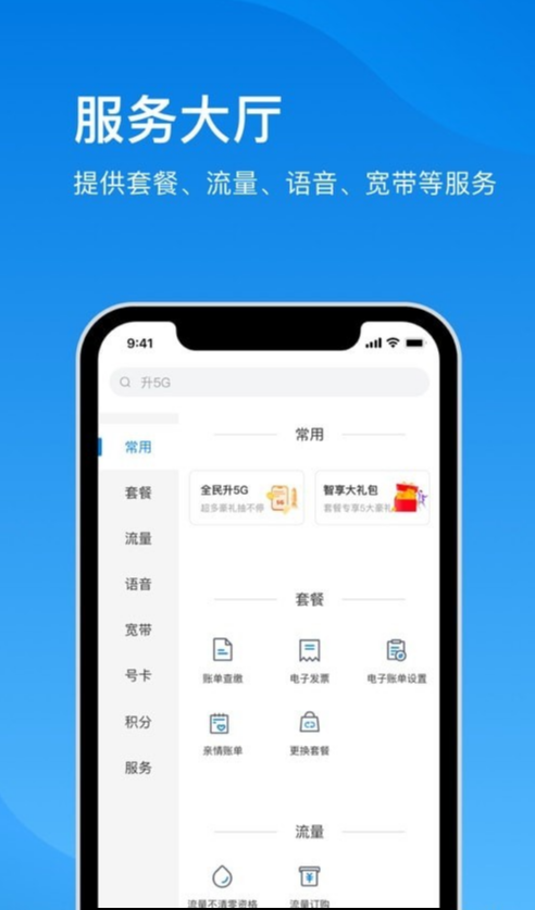 3. 服务大厅:提供全面的电信业务办理服务,包括宽带新装、套餐变更等。