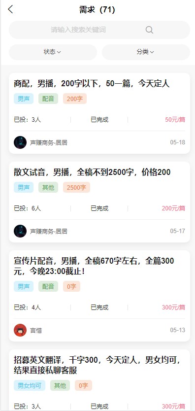 3. 查看与接单:审核通过后,用户可以查看平台上的各种配音任务需求,并根据自己的兴趣和能力进行接单。