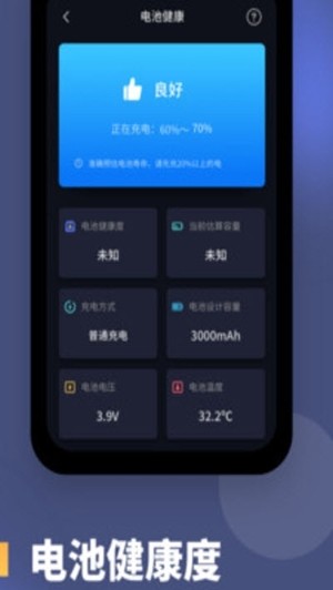 1. 实时监测和记录手机电池的健康状况,提供详细的电池健康报告。