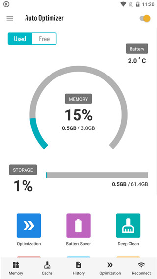 3. 点击主页按钮、屏幕关闭时、按内存使用率或按设定的间隔执行自动优化,也可点击快捷键手动执行优化。