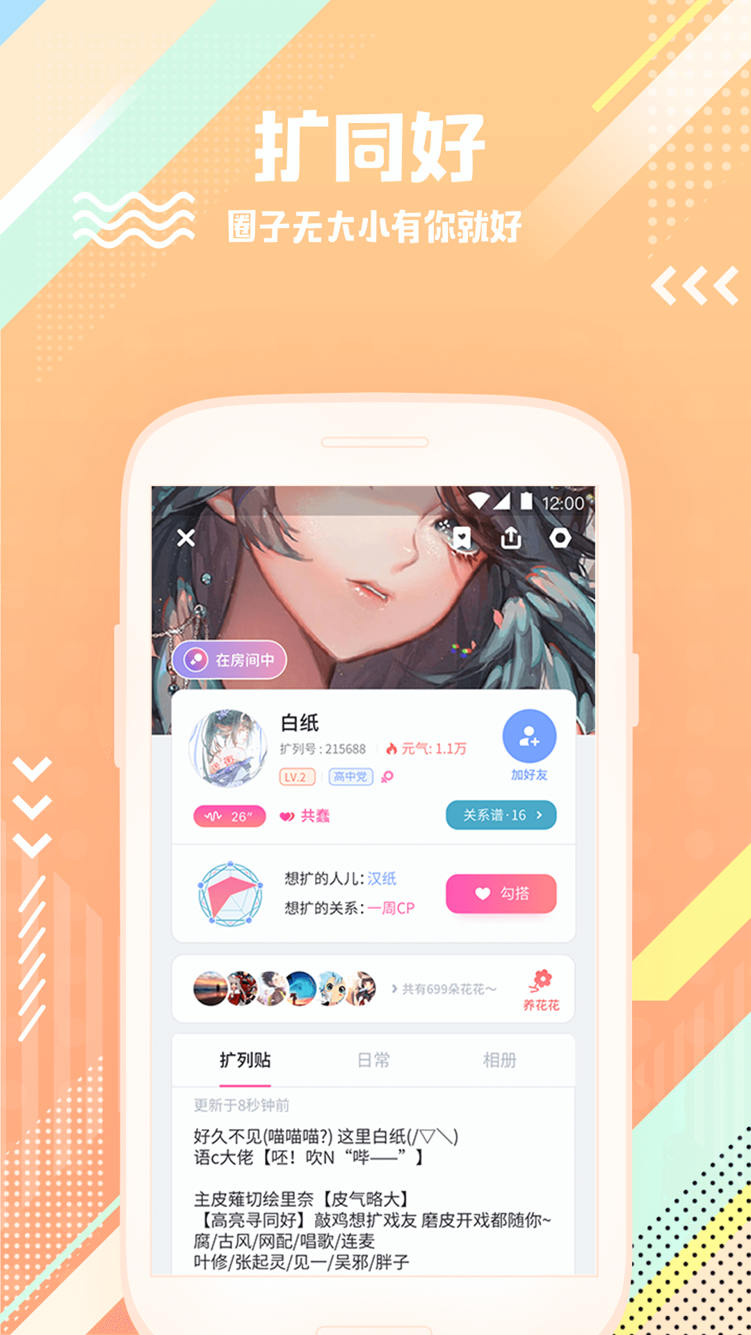 5. 社交效率高:扩列通过智能算法推荐最合适的交友对象,同时提供了多种便捷的交友方式,让用户能够快速找到志同道合的朋友。