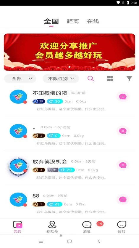 彩虹鸟基于用户的地理位置、年龄、兴趣等信息,通过智能算法精准推荐可能感兴趣的交友对象,从而简化了用户找寻潜在伴侣或朋友的过程。2.