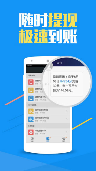 2. 收益提现:用户可将收益提现至支付宝或兑换q币、话费等。