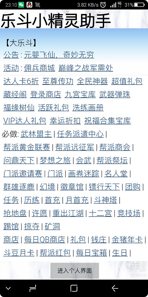 乐斗小精灵是一款专为q宠大乐斗游戏开发的安卓版小助手,它能够帮助玩家快速完成游戏内的各种繁琐操作,并具备一些手机本身无法完成的功能,如微端挂机等。这款软件极大地提升了玩家的游戏体验,使得玩家能够更加轻松地享受游戏带来的乐趣。