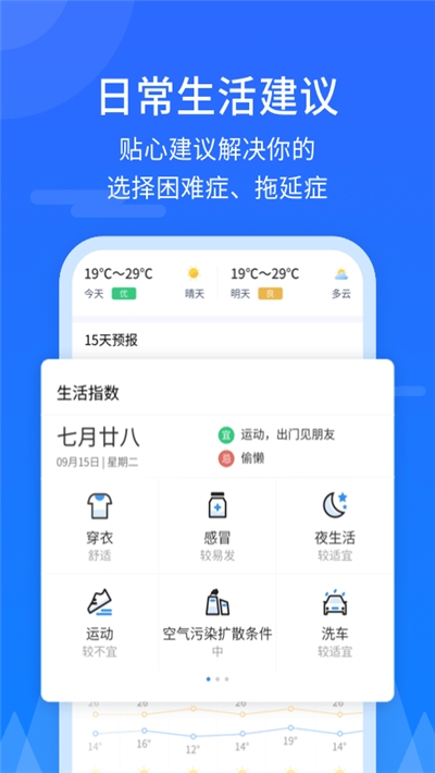 生活指数功能,如紫外线、适应度、洗车、感冒易发程度等,为用户提供贴心的生活建议,助力健康生活。5.