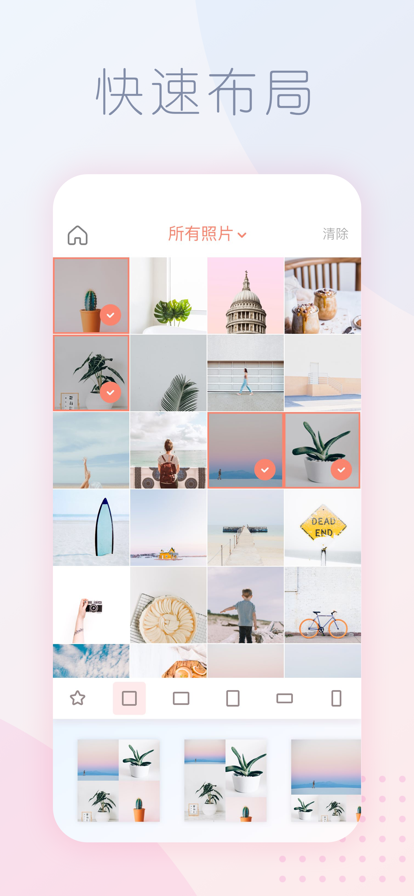 2. 经典布局选择:根据选择的照片自动生成各式模板,支持多种比例和布局方式,如四宫格、九宫格等。