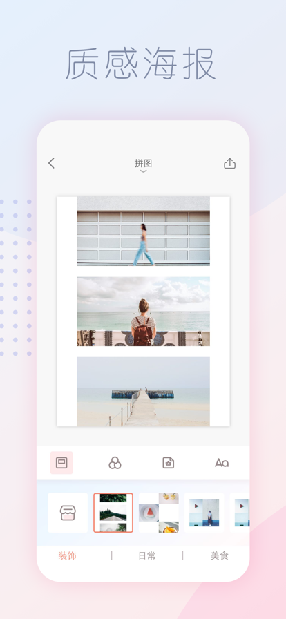 1. 提供多样海报模板:软件内含多种风格的海报模板,包括装饰、美食和日常等,用户可以根据图片内容选择合适的海报样式。