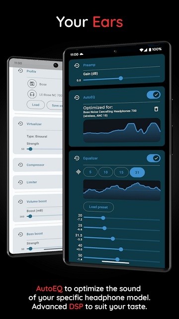 4. 先进的均衡器功能:支持前级增益、压缩器和限制器,拥有多种均衡器预设,可根据不同耳机设备自动切换。