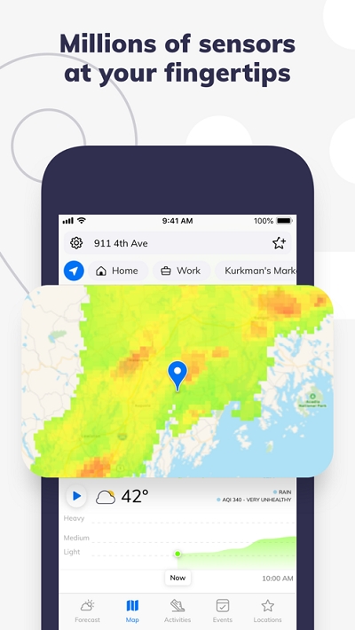 2. 微观天气预报:基于先进的ai/ml模型,climacell天气能够预测高度精确的天气状况,包括降水、温度、风速等。