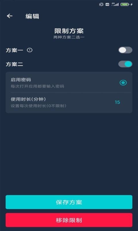 2、能够给app设置固定使用时长,而且能够设置输入密码才能使用(使用一段时间,退出,在进入需要密码)。