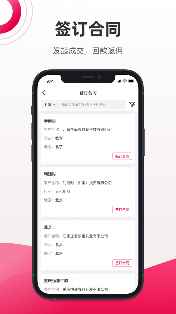 将全部广告客户信息开展分层次、体系化集中呈现在潮代App中,并为合伙人给予共享客户的搜索、查看、管理等服务工具