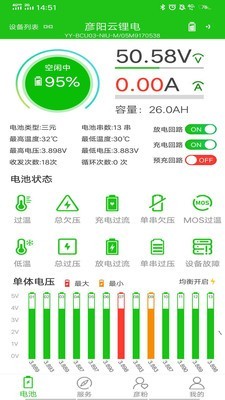 随时随地翻开APP毗连上电池便可看到各项具体数据信息,如电压、电流、温度、容量、SOC等;