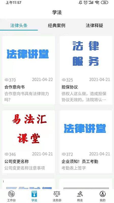 2、app为用户给予了工作台、学法、法务部、用法和我的五大板块服务