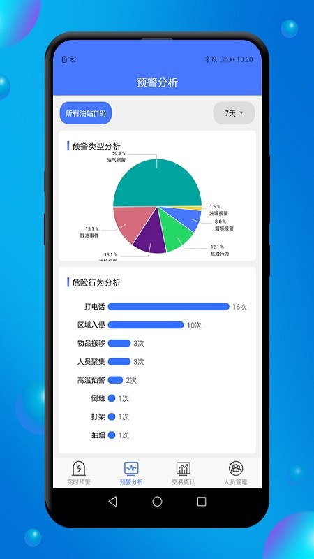 赋能管控app能够时实检测加油站的详细情况,有任何异常情况都能及时知晓并处理,避免发生重大的灾害,还会时实检测是否存在危险操作,降低人为造成危险的可能性,检测预警的功能十分强大,保障了加油站能够安全营业,也能够及时处理发生在加油站的各种问题。