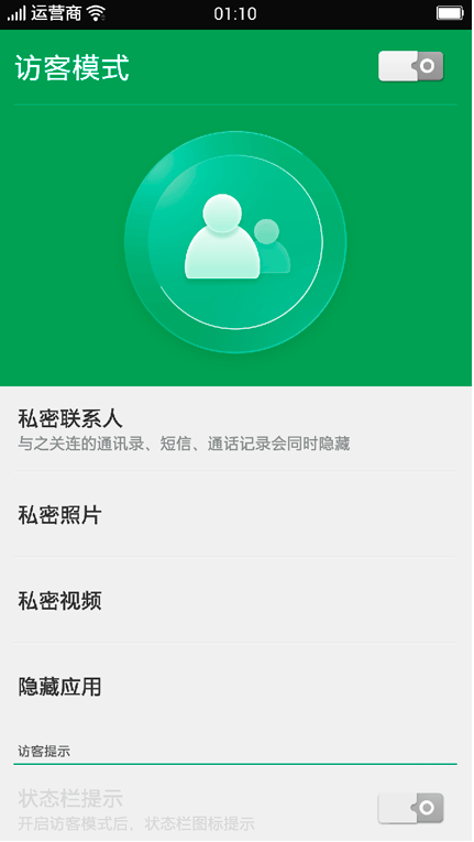 状态栏提示:当设置了访客密码后,开启/关闭该开关,在访客模式下,状态栏有/没有对应图标提示。