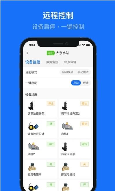 时实查看水站设备、仪表等运行状态,支持运程操纵自控系统的启停以及远程操纵单个设备的启停