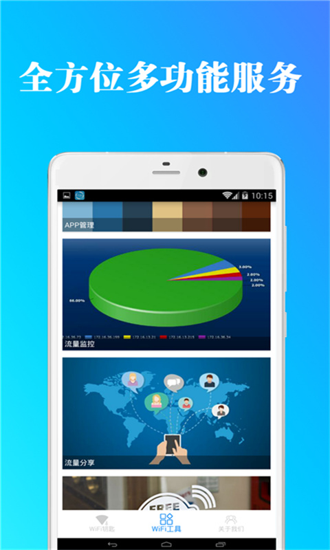 1、能够保证用户无线搜集运用平安的办理东西,自带了多样化的性能板块不论是搜集的速度测试对搜集的动摇环境也能开启清楚的领会;
