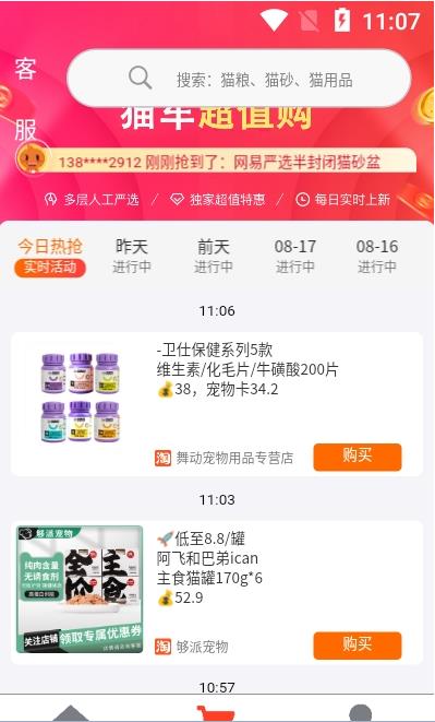 2、自在搜刮选购,另有每一天热抢专区,帮忙用户低价采办优良产品,除此以外,另有养猫攻略;