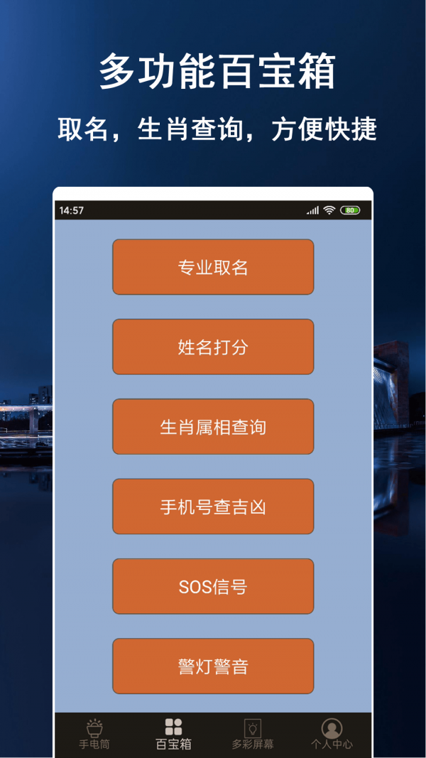 多彩闪光手电筒是一个电筒照亮服务软件,利用手机来照亮各种黑暗,一键就能够简单的启动,操作都非常的简便,多种屏幕光彩,支持很多的照亮设置,多功能的宝箱,不管是取名还是生肖的查寻都非常的简单便利,让无数的黑夜都能被照亮,服务都非常的周全。
