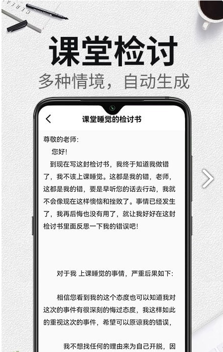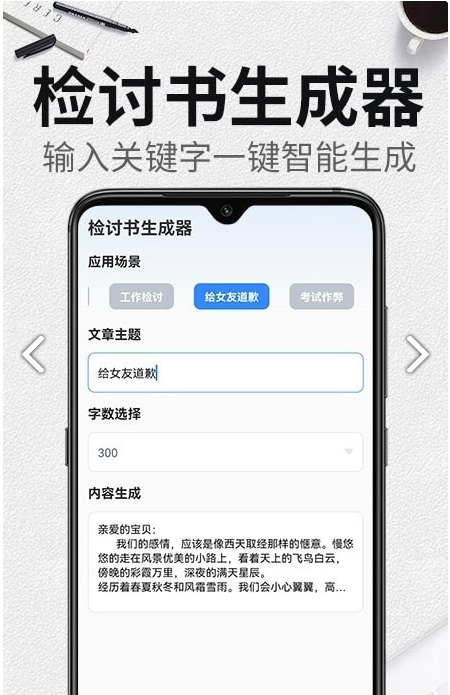 能够在手机端非常方便的生成检讨书,并且能够直接查看生成好的检讨书,以及支持保存导出使用。