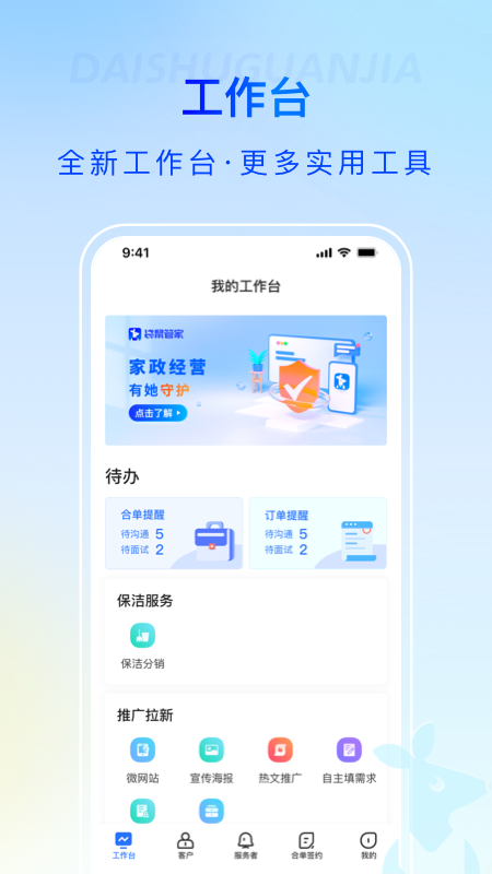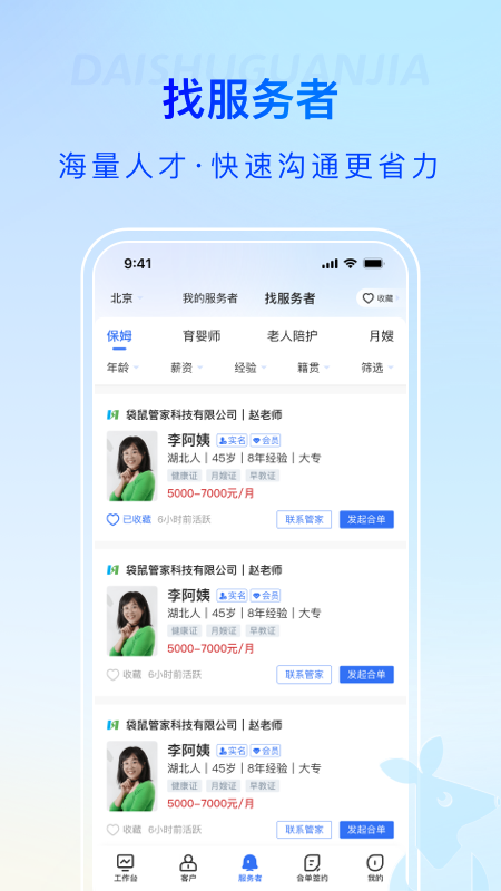 袋鼠管家平台是一款不错的家政管理软件,里面的服务和功能都很不错,一系列的家政服务都能够为你处理,用户的各种家政需求都能够去满足到,属于自己的工作台,找服务者都很简便,简历信息都能详细的查看,信息内容都展现的详细,操作都很简便。