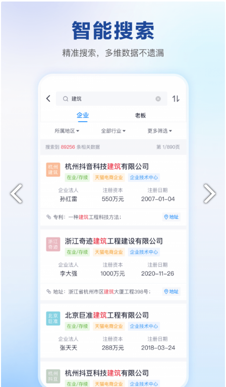 3、操作便捷:输入企业名称、法人股东或商标名等关键词即可一键查企业、查老板