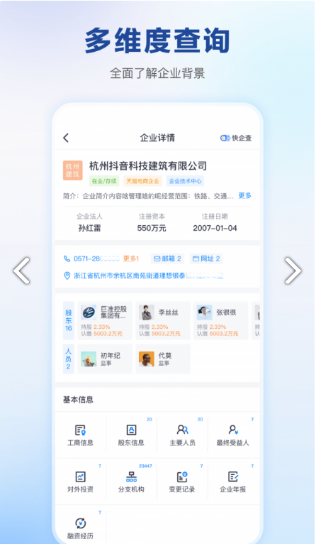 1、信息全方位:和工商局等网站数据时实对接,企业工商、股东、高管、变更记录简单明了。