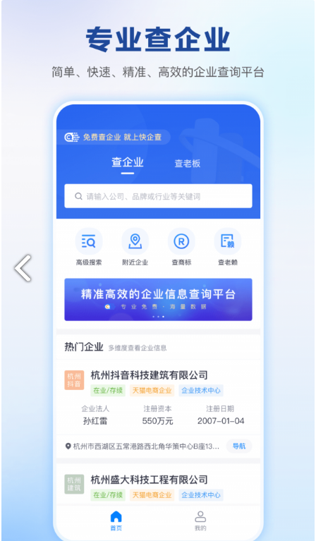 快企查帮助用户快速查寻企业,企业岗位信息也能线上查寻,搜索关键字就能取得到相关企业信息,附近的企业都能够去查寻了解。