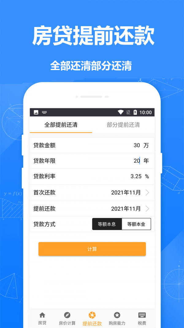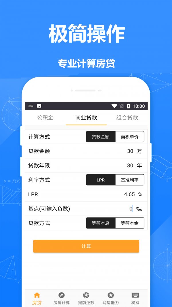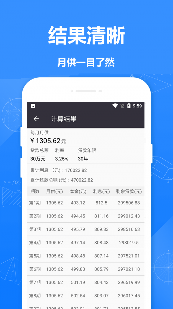 计算精准:支持公积金贷款计算、商业贷款计算以及组合贷款计算等多种贷款方式,另外可在等额本金和等额本息还款模式中随意切换,智能计算最优贷款计划,还款计划一览无余
