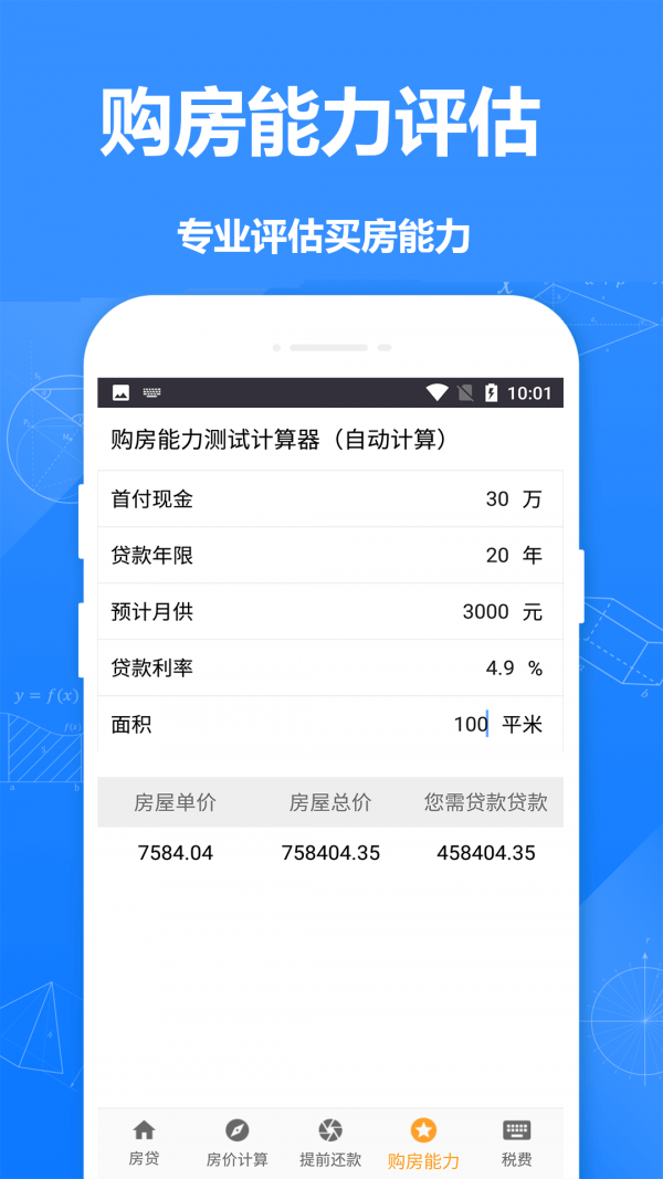 安居房贷计算器app为用户们带来了非常专业的房贷计算服务,能够简单评估自己的购房能力,避免房贷对用户们的正常生活造成影响。另外能够在输入各项数值后查看自己每月所需要还款的金额,让用户们能够提前做好还房贷的准备。软件给予的计算也是极为精准的,能够按照不同的方式计算出贷款的详细金额。