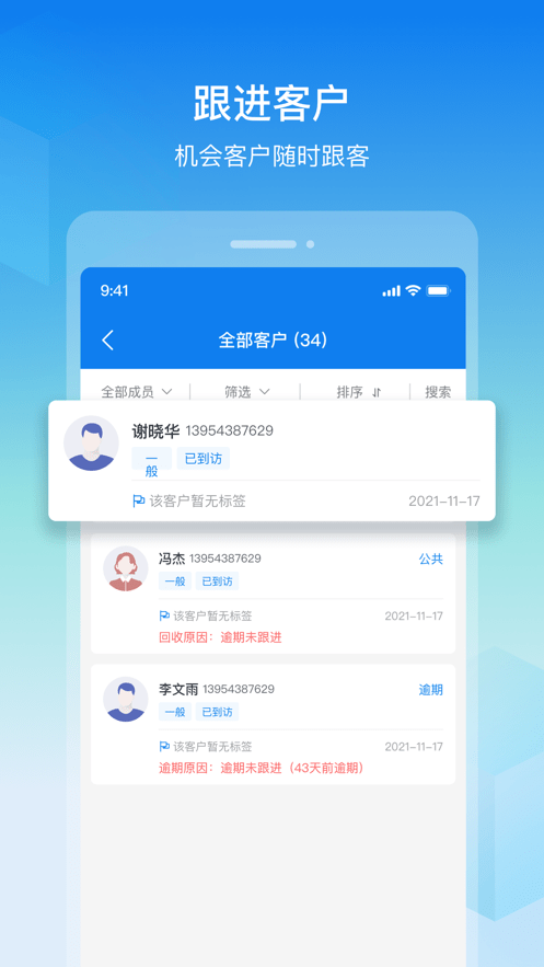 查寻任何与客户相关的数据都会比较方便,能够查看到访记录以及跟进的记录