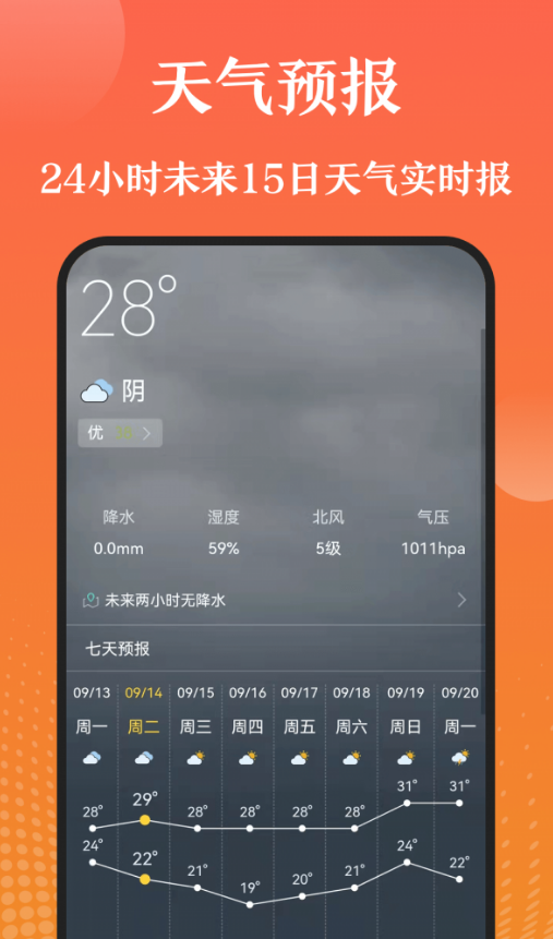 给予时实的天气预报信息,包括温度、湿度、风力等,让用户随时掌握天气变化