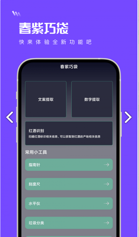 春紫巧袋是一个使用的手机工具箱软件,里面的功能能够处理日常各种小问题,定位导航,内容识别,编辑信息,修图全是有的,功能都划分的详细,一个工具箱能够让你简单使用手机,功能模块都划分的详细,甚至比自带的应用还要好用,操作比较容易。