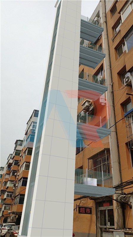 5.加装电梯钢结构外封板可选用多种材料,不锈钢、铝塑板以及幕墙玻璃,预留玻璃驳接爪位或者卡扣式玻璃安装位,不仅安装方便,采光性能好,而且外表美观。