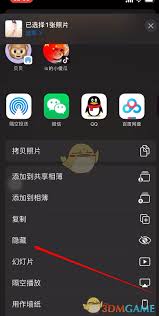 选中照片后,点击屏幕右上角的“分享”图标。在弹出的分享菜单中,向下滑动找到“隐藏”选项并点击。此时,你所选的照片就会被隐藏起来。