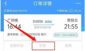 找到需要改签的车票订单,点击进入订单详情页面。在订单详情页面中,会显示车票的基本信息、乘车日期、车次等内容。在页面下方,通常会有“改签”按钮,点击该按钮即可进入改签页面。