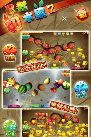 1. 基本操作:玩家通过手指在屏幕上滑动来控制忍者的刀具,屏幕上出现的各种水果。速度越快,连招越多,获得的积分也就越高。