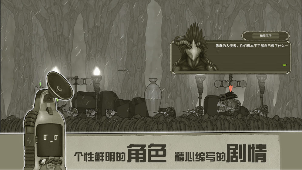 1. 独特的手绘风格:游戏采用黑白灰三色手绘风格,画面简洁而不失美感,ui设计融合蒸汽朋克元素,极具特色。