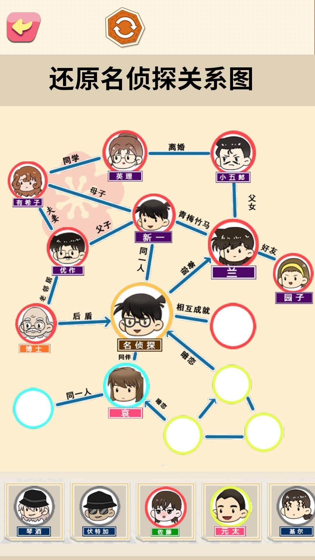 3. 每一关都有特定的人物和关系出现,玩家需要提前猜测并正确还原它们之间的关系网。