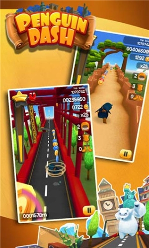小企鹅大逃亡(penguin dash)是一款以企鹅逃脱为主题的益智休闲类跑酷游戏。玩家将扮演一只从北极熊囚禁中逃脱的小企鹅,踏上一段充满挑战与冒险的环球之旅。游戏背景设定在因温室效应导致南极冰川融化的未来,企鹅家族被迫迁徙,而我们的主角则要在北极熊的追捕下,穿越七大洲,躲避各种障碍,收集金币,解锁新角色和装备,以延长生存时间。游戏画面简洁清新,操作简单易上手,倾斜设备即可控制企鹅移动方向,点击屏幕进行跳跃和滑行,非常适合在闲暇时娱乐放松。